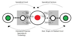 - Outsourcing means that the core transfers some of its economic functions to a subordinate town(s) in the urban system. Due to outsourcing, the base of many economic activities shifts to such subordinate towns. The core has to outsource its economic functions to other towns because the cost of production in core becomes very high due to high cost of land and costly labor (Fig. 3).