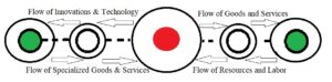 - Since many cities become equal in authority, it does not mean there will not be any kind of flow of labor and resources between the core and periphery. In reality, the cities become spatially integrated or dependent through the process of division of labor. It means that different cities specialize in different economic functions therefore, each city depends on another city for supply of a certain product (Fig. 4). For example, the Maruti-Suzuki factory in Gurugram depends on Jamshedpur for supply of steel. Such division of labor between cities increases economic and logistical efficiency.