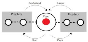 - The core imports raw material and labor at low cost from the periphery. In return, it pays low rent and wages to the inhabitants of the periphery. Further, the core exports costly finished goods to the periphery. So, the periphery faces a balance of payment crisis due to costly imports and cheap exports. So, it increases exports to core to sustain its import of finished goods. Finally, the periphery becomes dependent on the core.