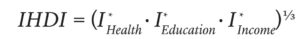 Ultimately, when we multiply the Index of Health ‘Ih’ with (1-Ah), Index of Education ‘Ie’ with (1-Ae) and Index of Income ‘Ii‘ with (1-Ai), we get an inequality adjusted index of health, education and income, respectively.