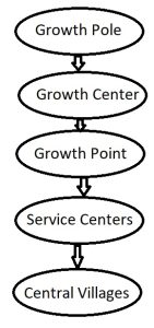In fact, Mishra used the approach of Christaller’s Central Place Theory in combination with Growth Pole Theory. His model elaborates the process of spatial diffusion of the economic growth and innovation from growth pole to smallest human settlement through multiple nodal points. Nodal points are cities and towns in which people of surrounding area exchange goods and services.
