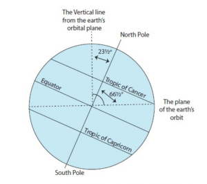 - Earth is inclined on its axis at and angle of 66.5° from its orbital plain and 23.5° from the perpendicular line with respect to orbit (Fig.1).