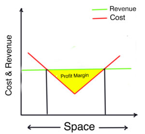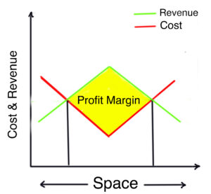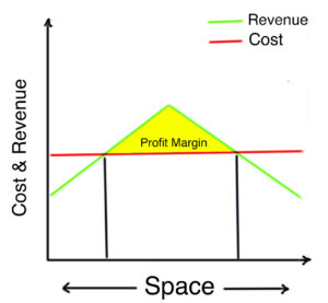 In this case, the cost of production remains constant over space while the revenue changes. So, the only way to increase profit is by increasing the sale of the goods. In real world, the demand exists unevenly over space. The large urban centers have the highest demand and it decreases outwards towards the rural areas. In such scenario, the producer may locate anywhere at a location where the revenue exceeds the cost. The zone between the points where the cost becomes equal to revenue is spatial margin of profitability (See Fig. 1)
