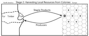 - They begin to export the raw materials such as timber, fur, wood etc. from the colonies to the metropolis . This trade is one way. This stage represents beginning of wholesaling of products.