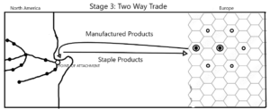 In the third stage, the two way trade starts. The metropolis imports raw material and export manufactured products from and to the colonies, respectively.