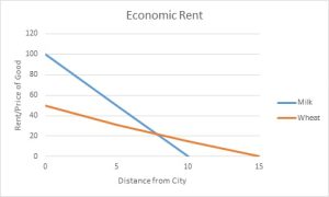 - Total Revenue and Price of Goods: Revenue is defined as total quantity of goods produced multiplied by the price of goods. The goods with higher market price will be located relatively closer to city than cheaper goods and vice-versa. In Fig. 1, the price of milk is higher (Rs. 100) than wheat (Rs. 50), therefore, milk products are produced near the city (10 Kms.) while wheat is produced farther (15 Kms.). Note that price of product is only a proxy for economic rent and not a synonym.