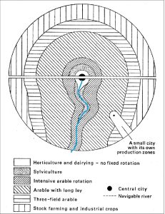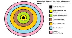Broadly speaking, Von Thunen said that the land-use around a city is determined by the value of products grown on the land. If the value of product is high, it will be grown near the city. Similarly, low valued products will be grown farther from the city.