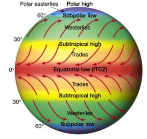 Fig. 1: Global Wind Circulation. Source: The Atmosphere, 8th edition, Lutgens and Tarbuck, 8th edition, 2001 - Firstly, the winds blow from the high pressure regions to the low pressure regions.
